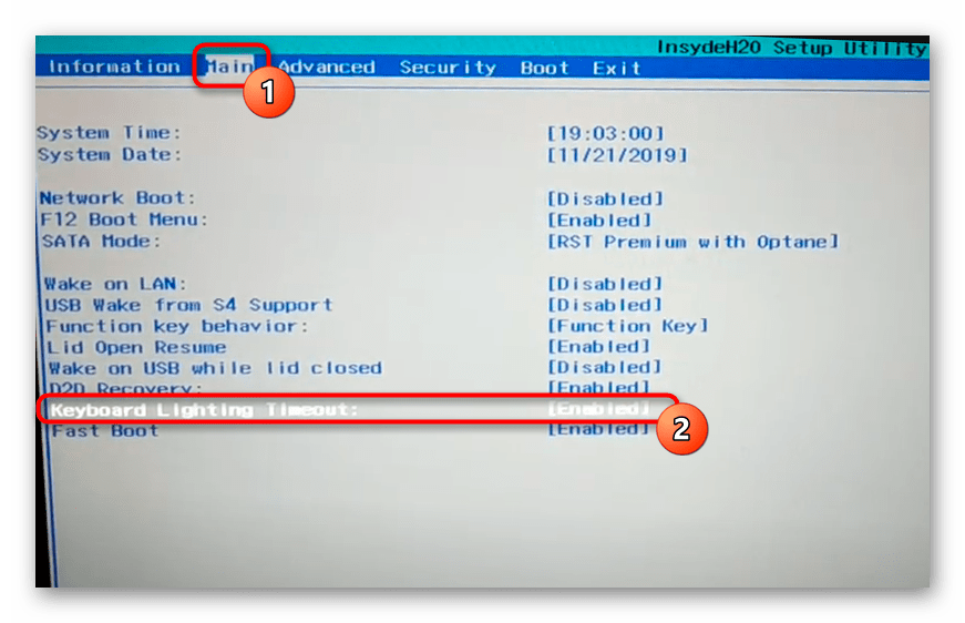 - Перейдите на вкладку «Main» и найдите там пункт «Keyboard Lightning Timeout». Нажмите по нему Enter и смените значение на «disabled». Тем самым вы уберете отсчет времени, после которого подсветка автоматически отключается при бездействии клавиатуры.