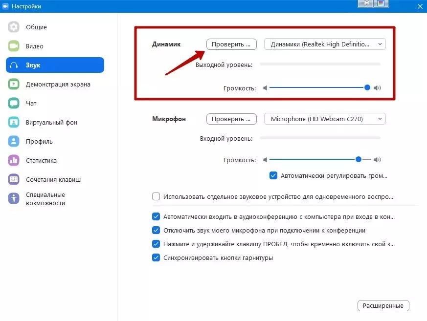 При помощи кнопок «Проверить» убедитесь в работоспособности динамика, а при необходимости и микрофона. Настройте уровень громкости и выберите устройство вывода звука.
