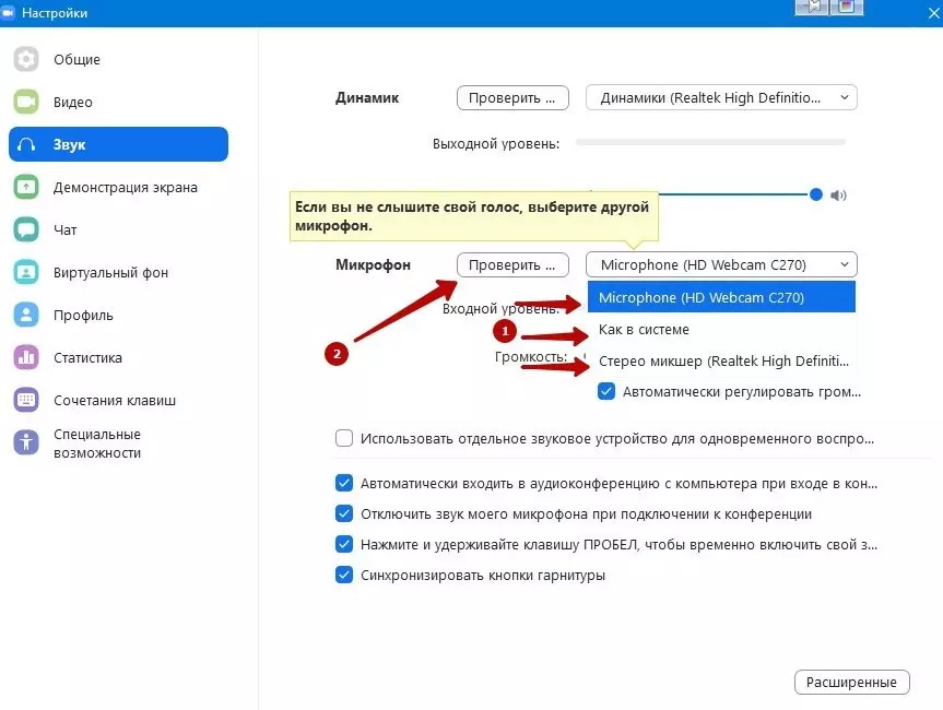 Если же проверили данный момент заранее, а звук не появился, то проблема в устройстве, используемого вами. При подключении к конференции вам будет предлагаться настройка звука в рамках входящего и выходящего звучания. Если звука нет, значит нужно изменить устройство входящего звука, то есть микрофон. Сделать это можно, нажав на кнопку звука. Zoom предложить вам ряд вариантов по выбору микрофона, а также оперативный тест. После чего нужно просто выбрать работающий микрофон.
