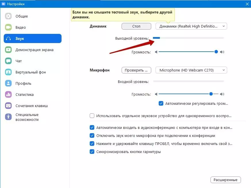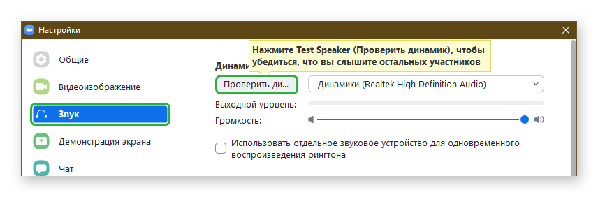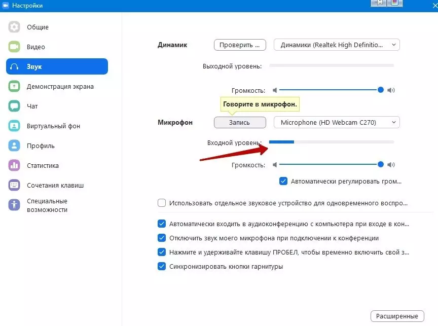 Зум при первом подключении автоматически проверяет работу динамиков, а также то, насколько вас хорошо слышно другим участникам: