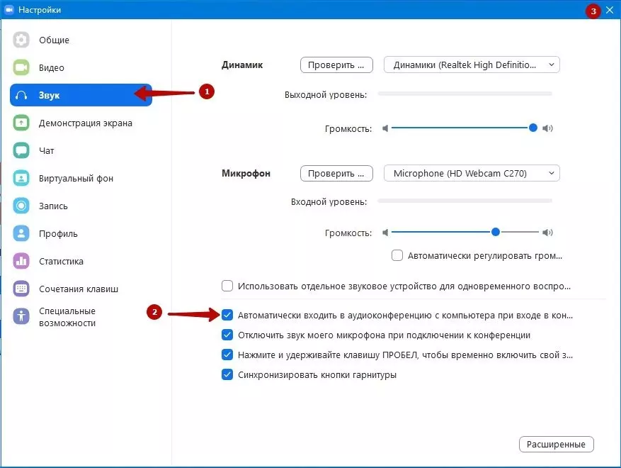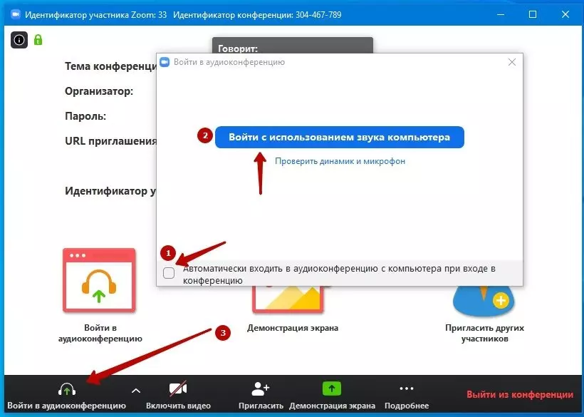 Нажмите на значок наушников (1), чтобы включить звук при масштабировании. Откроется рамка с флажком — «Автоматически входить в аудиоконференцию…». (2) и нажмите «Войти с помощью компьютерного аудио». (3).