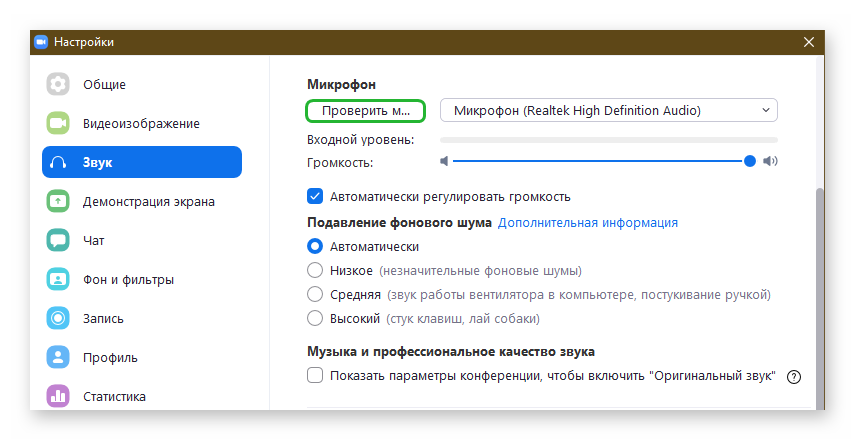 Если вы не знаете как проверить звук в Zoom без конференции на своем компьютере, посетите раздел настроек и отыщите соответствующие параметры. В нем практически всегда присутствует встроенный компонент, который поможет проверить уровень звукопередачи и его качество.