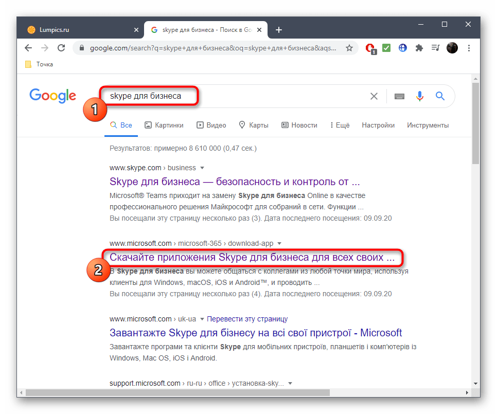 - Воспользуйтесь ссылкой, чтобы перейти на требуемую страницу сайта, или найдите Skype для бизнеса через поисковик. При использовании второго варианта учитывайте, что вам нужен именно сайт Microsoft, а не Skype, поскольку в последнем эта версия уже была удалена.