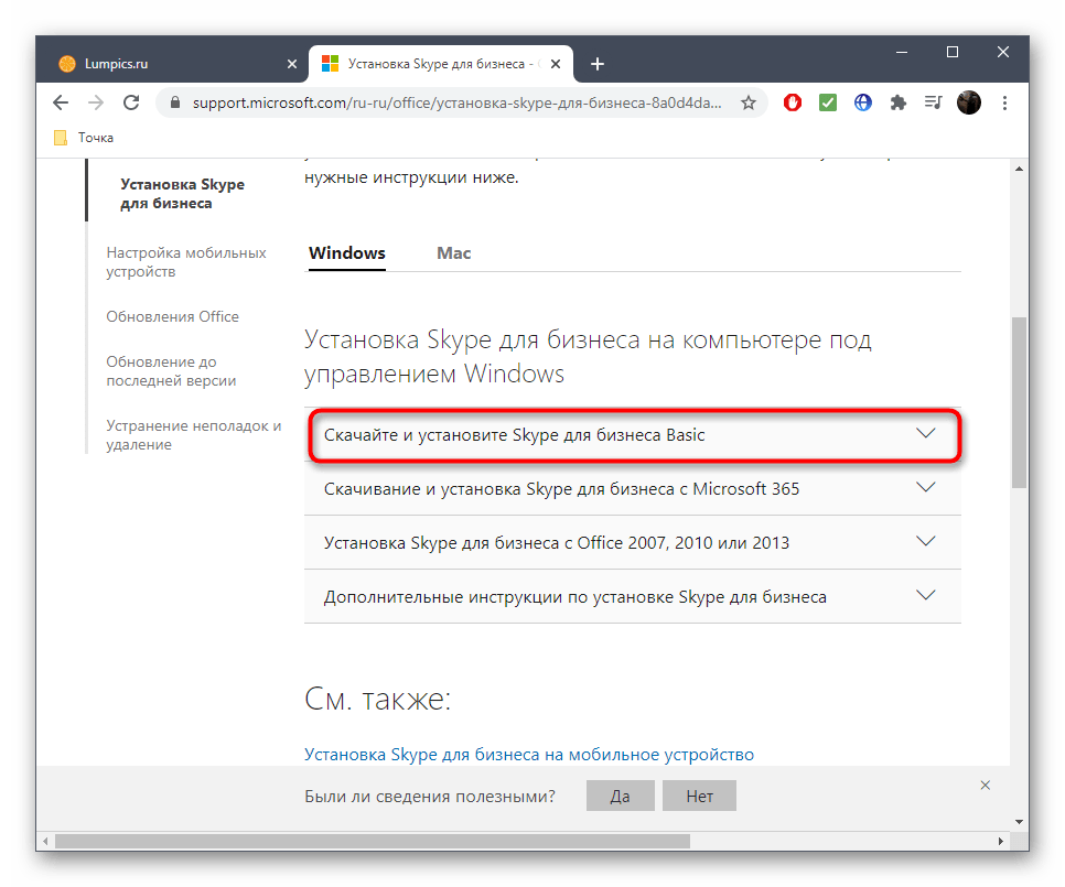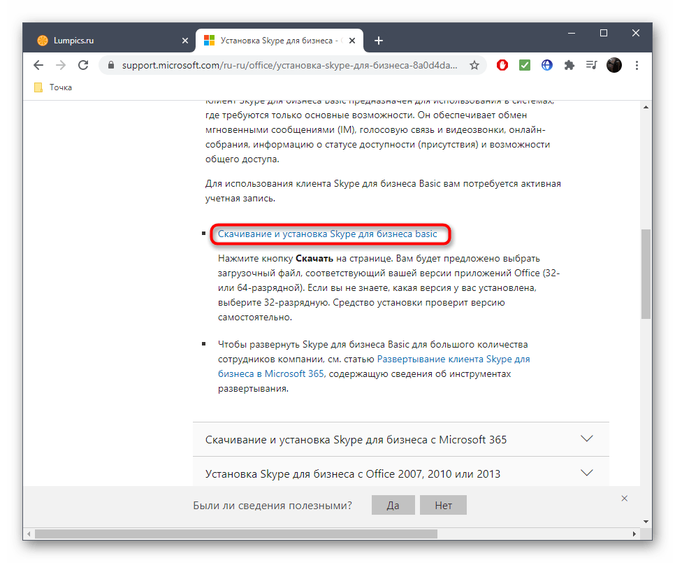 При открытии страницы поддержки Майкрософт разверните раздел со скачиванием и установкой программы.