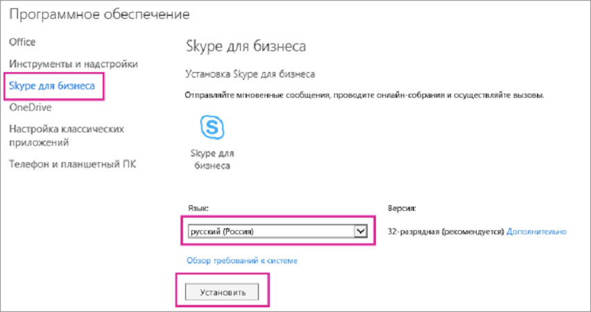 5.Если на следующей странице есть ссылка «Skype для бизнеса», нажмите на нее и, выбрав русский язык, нажмите кнопку «Установить»; если вы увидите страницу, которая перечисляет продукты, входящие в пакет «офиса», и если среди них есть искомый, значит нужно нажать кнопку «Установить», и на компьютер будут установлены все программы из данного пакета, в том числе и «Скайп для бизнеса».