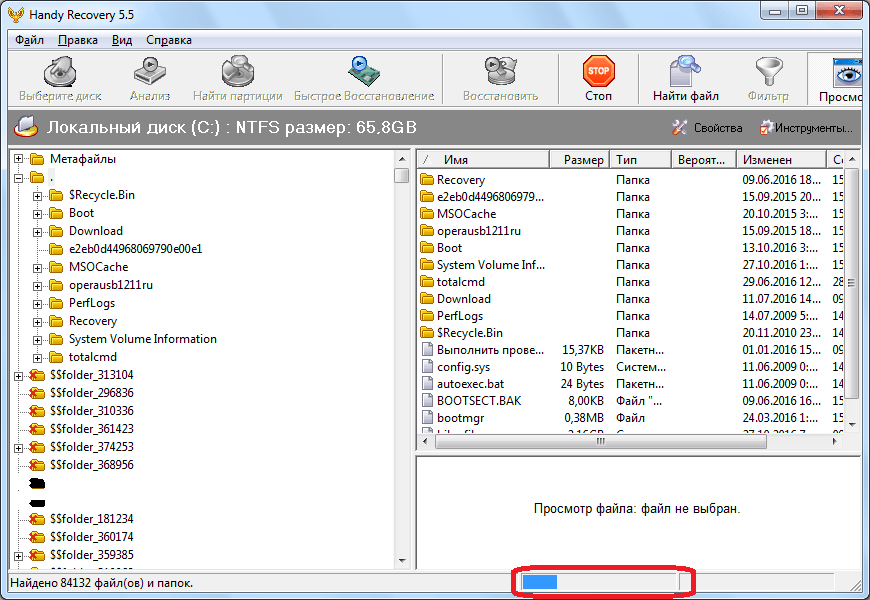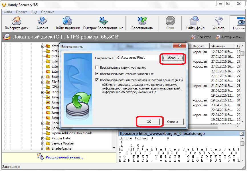 После того, как он закончен, переходим в левой части окна Handy Recovery в директорию расположения профиля Оперы, адрес которой мы выяснили чуть ранее.