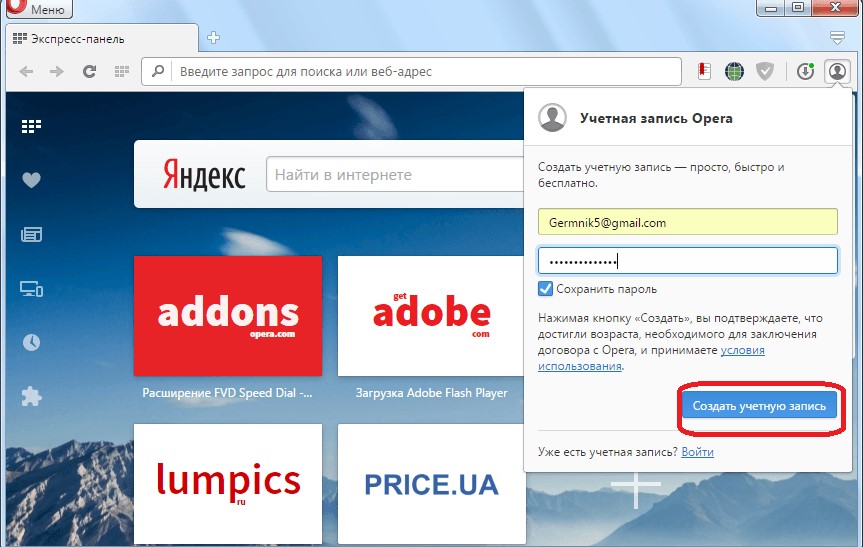 - Справа откроется окно входа в профиль Оперы. Если учетной записи еще нет, ее тут же можно создать.