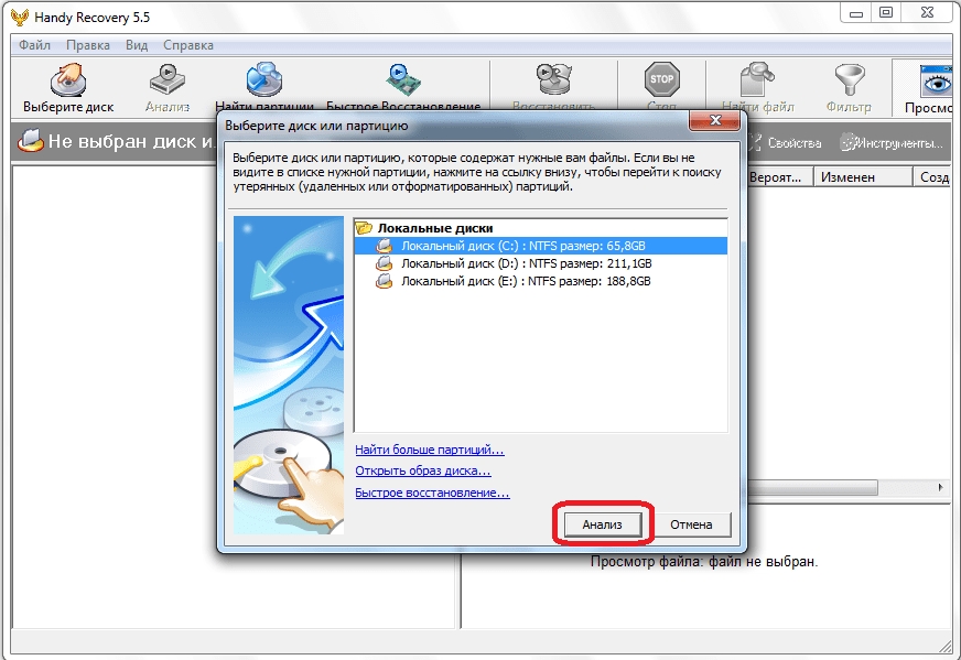 Теперь, запускаем приложение Handy Recovery. Так как профиль браузера хранится на диске C, то выбираем именно его и жмем на кнопку «Анализ».