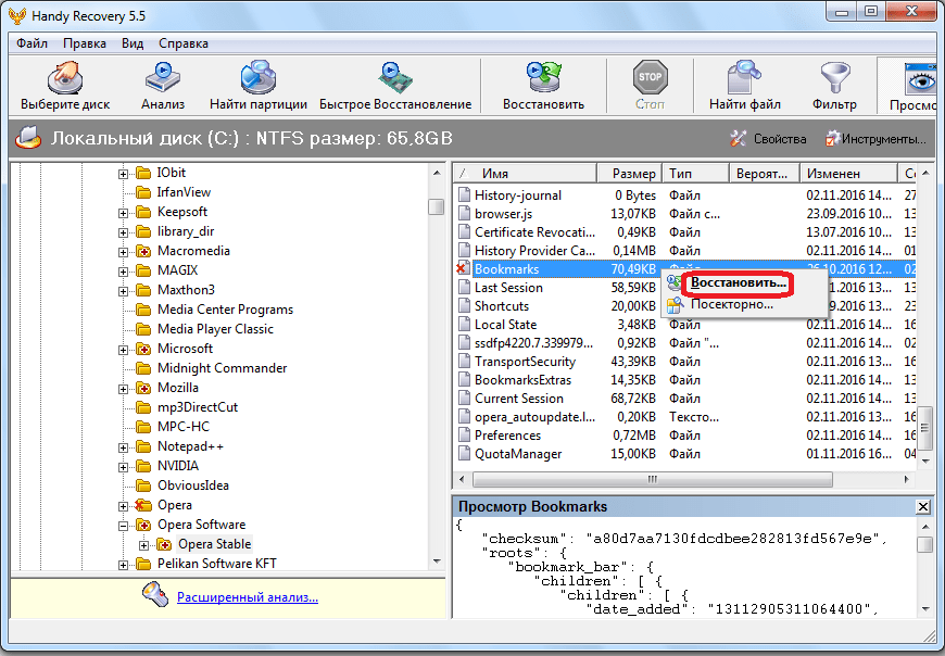 В этом случае, нужно постараться восстановить файл закладок с помощью специальных восстанавливающих утилит. Одной из лучших подобных программ является приложение Handy Recovery.