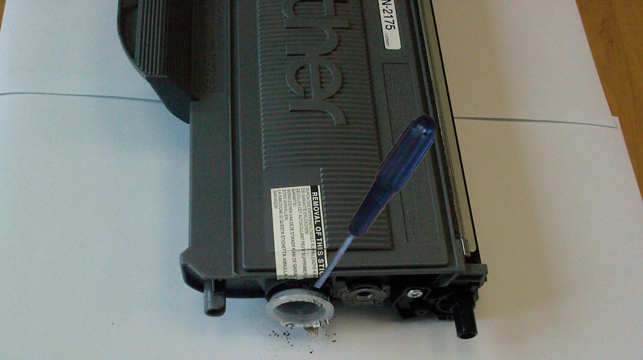 4. Вставьте отвертку под крышку и откупорьте ее. Предварительно подложите лист бумаги или газету, чтобы тонер не рассыпался по всему столу.