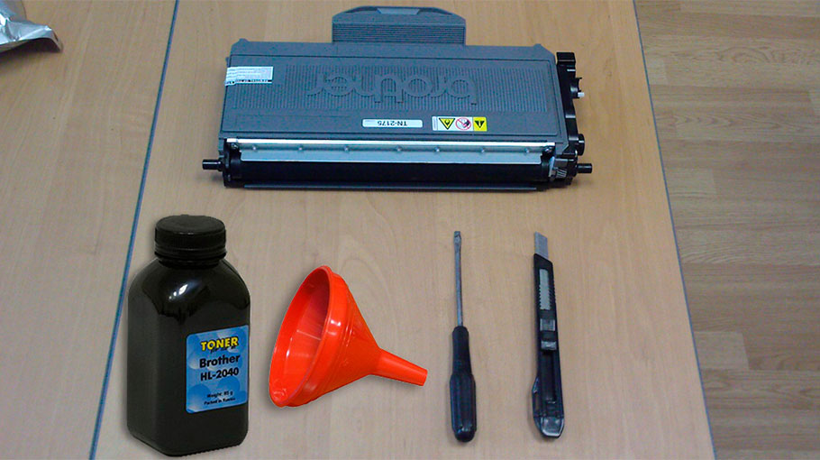 Прежде, чем заправить картридж TN-2175, потребуется тщательно подготовить рабочее место. Убрать все лишнее и накрыть чем-то стол (можно обычной бумагой формата А4, газетой или пленкой). Также потребуется взять инструменты и расходники, необходимые для пополнения красящего вещества. Для заправки лазерного картриджа Вам потребуется: