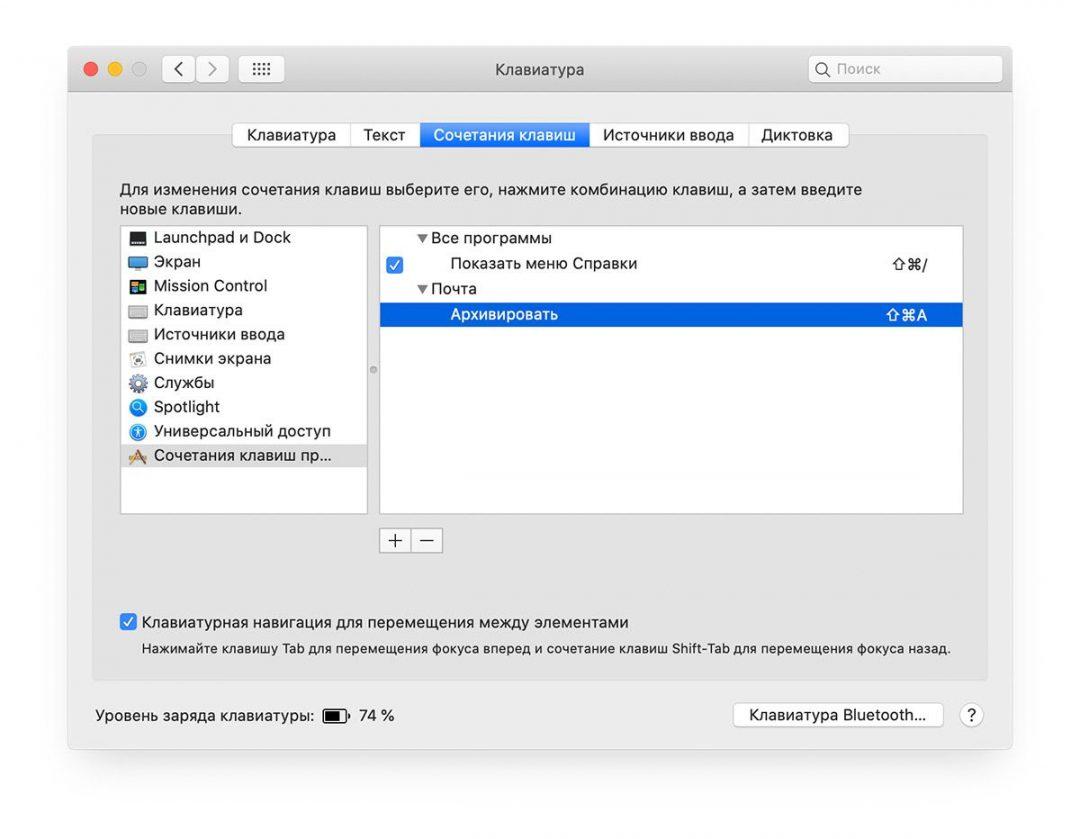 Если у вас Mac OS, вы можете назначить любые действия в любых программах через панель управления, раздел «Клавиатура». Например, здесь добавлена горячая клавиша, которая архивирует ненужное письмо в почтовом клиенте: