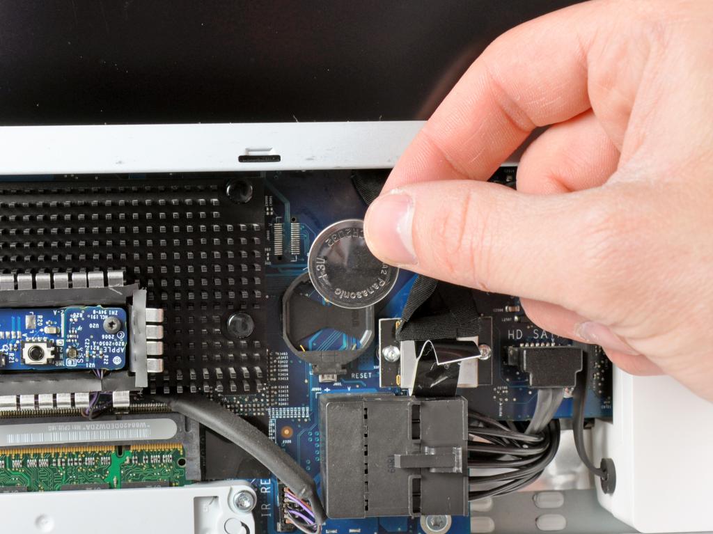 - Найдите саму батарейку, которая выглядит как небольшой серебристый блин. На ней также может встречаться обозначение CR 2032. Иногда батарейка может находиться под блоком питания, в этом случае его придётся полностью демонтировать.