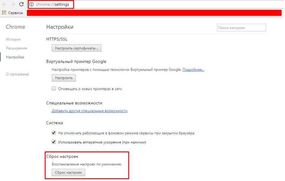 Зайдите в браузер, которым вы пользуетесь, например, Google Chrome, и далее сбросьте настройки до состояния настроек по умолчанию: