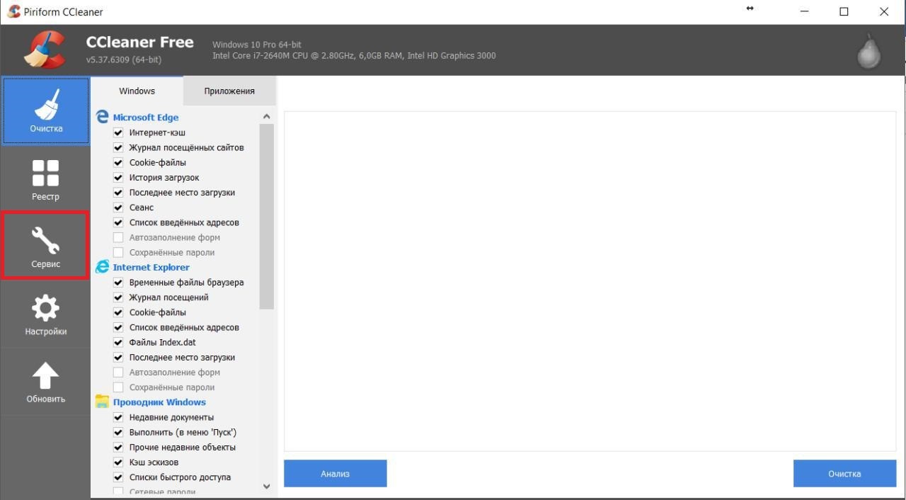 Рис. 3. Вкладка «Сервис»