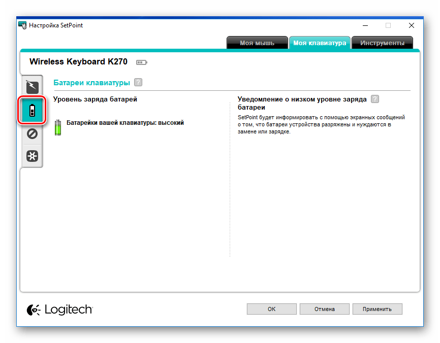 Уведомления SetPoint дают пользователю возможность просмотреть сведения об уровне заряда источников питания клавиатуры и мыши, не открывая приложение. Также при наведении указателя мыши на значок СетПоинт в области уведомлений можно почерпнуть информацию о задействованности режимов «NumLock»