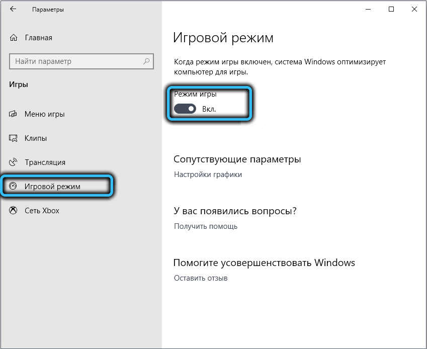 Отключение игрового режима (только для Windows 10)