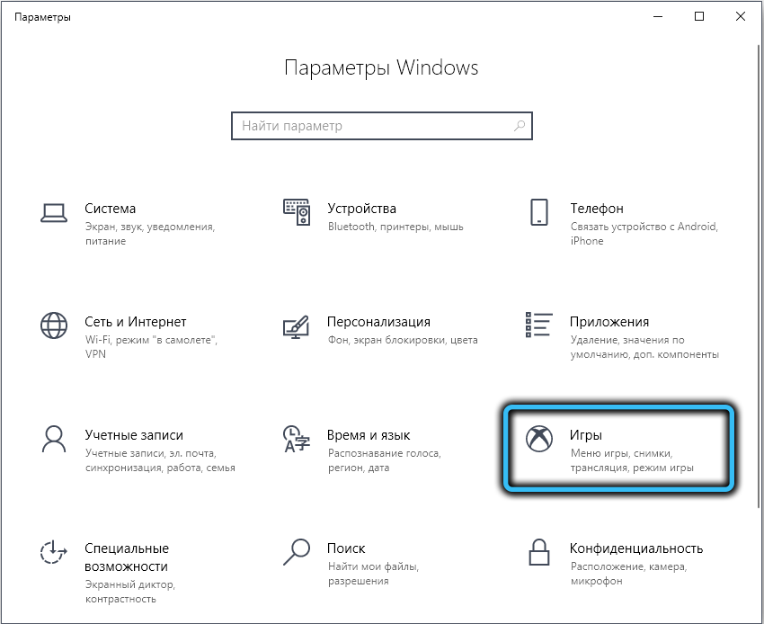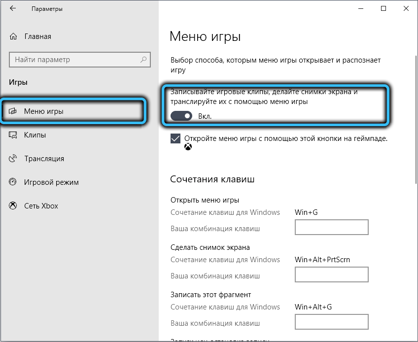 Для этого в меню «Пуск» переходим во вкладку «Параметры» (пиктограмма шестерёнки), кликаем по вкладке «Игры», выбираем пункт «Меню игры».