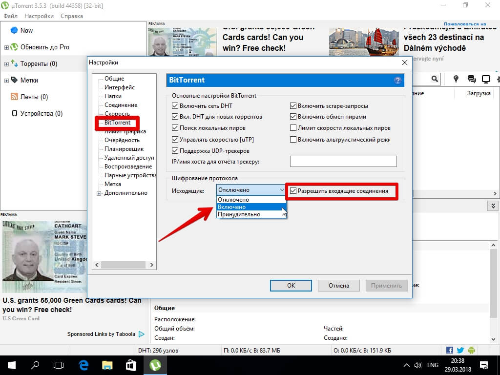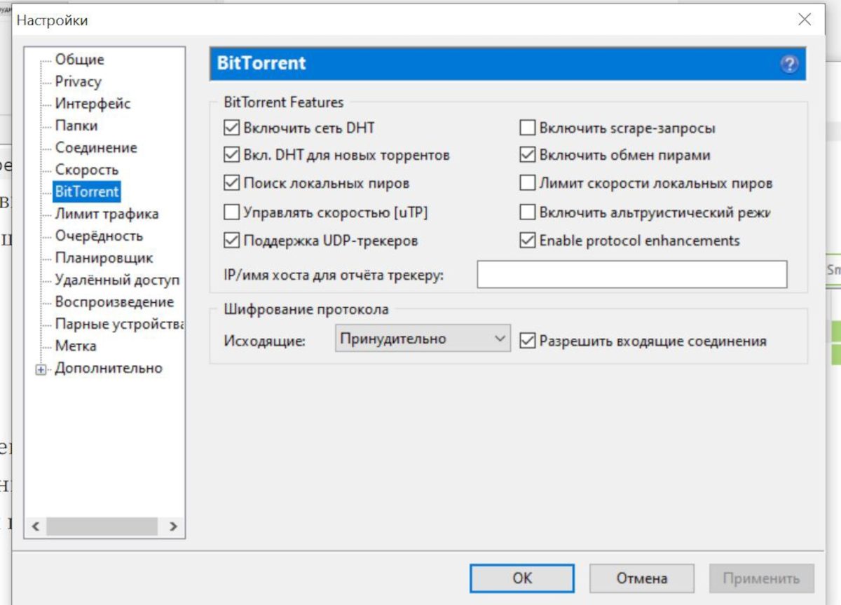 С помощью шифрования протокола снимается лимитирование скачивания, устанавливаемого провайдером при включении большого количества закачек через торрент-клиенты. Для его включения нужно зайти в настройки, выбрать слева «Bittorrent», а справа, в разделе «Шифрование протокола» выставить «Включено» на исходящих и поставить галочку рядом с «Разрешить входящие соединения».