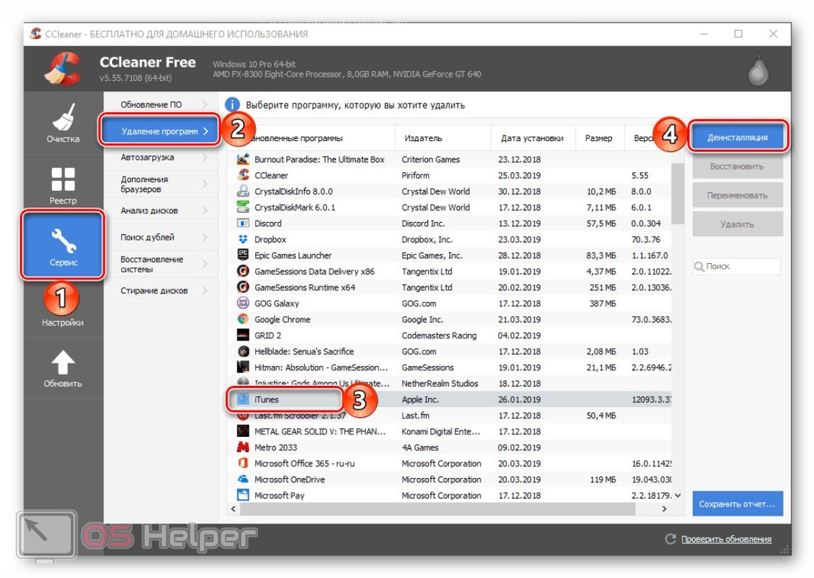 Теперь последуем совету из ошибки и обновим программное обеспечение Apple. Если оно не обновилось автоматически, значит, произошел какой-то сбой. Поэтому вам необходимо сначала полностью удалить ПО с компьютера. Если делать это через , то вы сразу сможете очистить ПК от временных файлов и прочего «мусора».