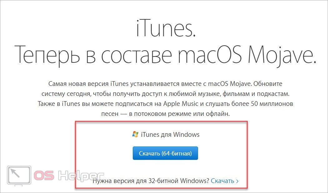Теперь следует заново установить актуальную версию программы. Если у вас Windows 10, то установите iTunes через Microsoft Store. В остальных случаях нужно перейти по и загрузить версию приложения, соответствующую разрядности вашей ОС.