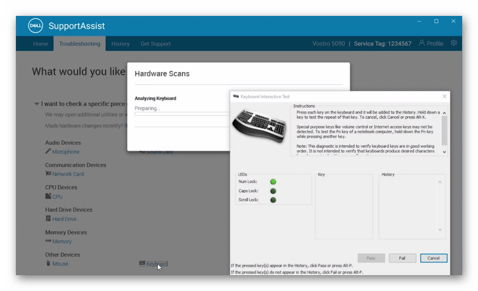 Начнется сканирование, в ходе которого будет открыта утилита для проверки клавиатуры. Вам предлагается нажимать любые клавиши и смотреть, реагирует ли на это ноутбук. Если в полях «Key» и «History» вы не видите того, что нажимаете, нажмите кнопку «Fail» внизу и следуйте указаниям ассистента.