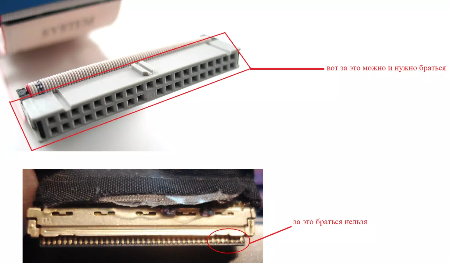 4. Если шлейф не поврежден, его все равно необходимо снять. Шлейф при этом брать за проводники нельзя ни в коем случае! Браться можно только за те пластиковые части, которыми он крепится к другим частям ноутбука. Для наглядности на рисунке 10 показаны те части, за которые можно браться и те, за которые браться нельзя. Правда, в клавиатурах обычно используются несколько другие шлейфы.