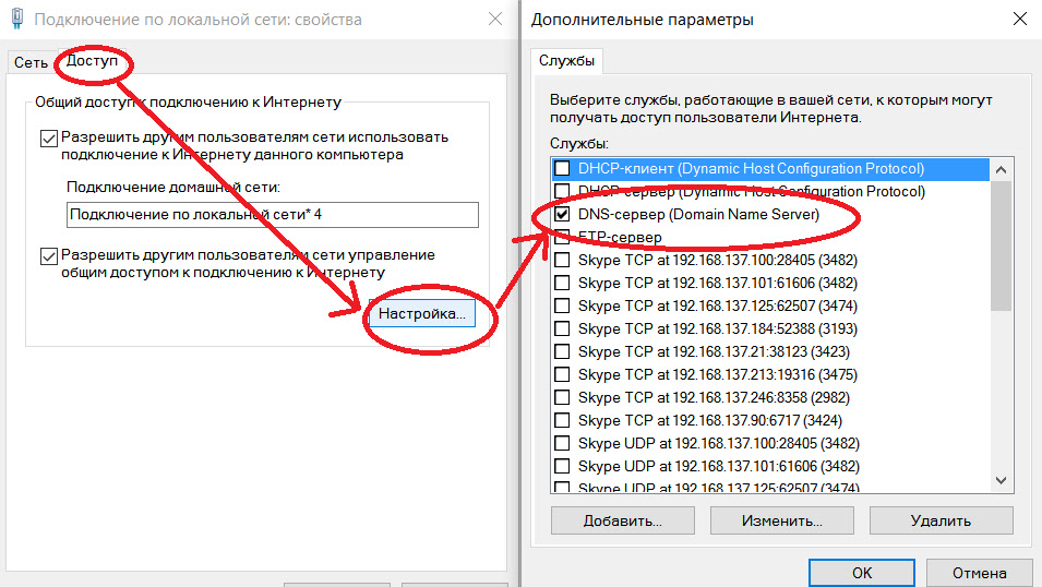 На вкладке «Доступ», где мы открываем общий доступ к подключению к интернету, нужно нажать на кнопку «Настройка», и в новом окне поставить галочку возле «DNS-сервер».