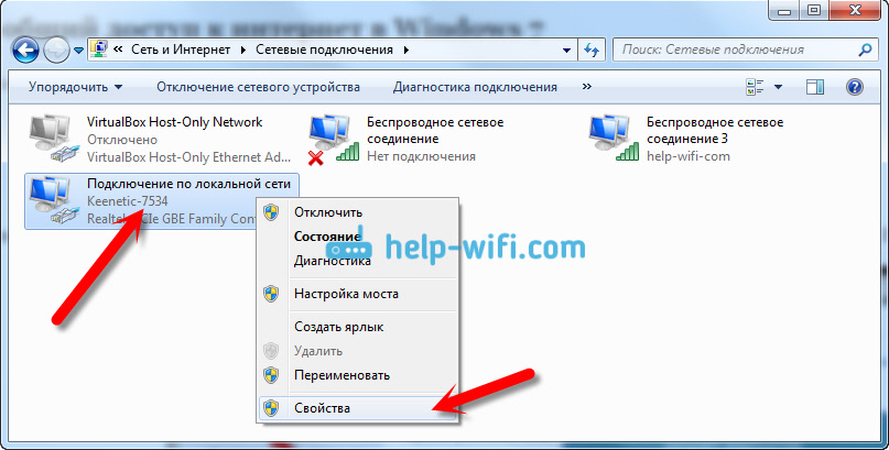 Нажимаем правой кнопкой мыши на тот адаптер, через который ваш ноутбук подключен к интернету. Выбираем Свойства