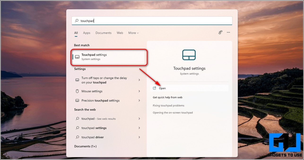 Нажмите клавишу Windows и найдите «Настройки сенсорной панели», чтобы открыть ее.