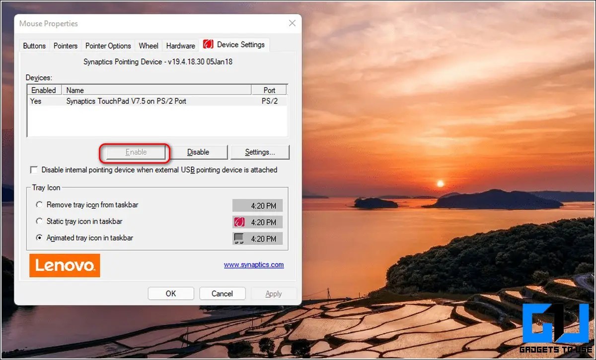 Выберите имя своей сенсорной панели и нажмите кнопку «Включить» под ней, чтобы снова включить ее в Windows 11.