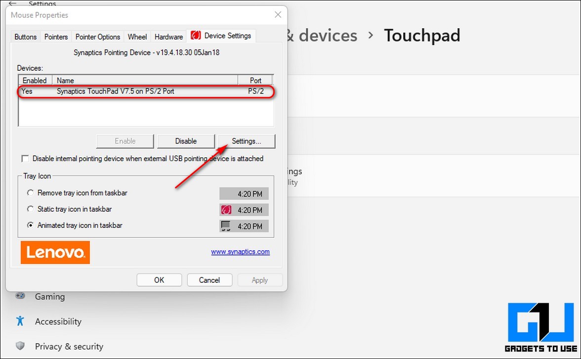 Выберите имя сенсорной панели и нажмите «Настройки».