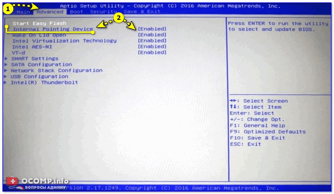 Разумеется, в зависимости от модели ноутбука и версии BIOS — ваше меню может несколько отличаться от моего примера. Как бы там ни было, просмотрите, нет ли у вас устройства с названием «. pointing. » (или «. Touchpad«).