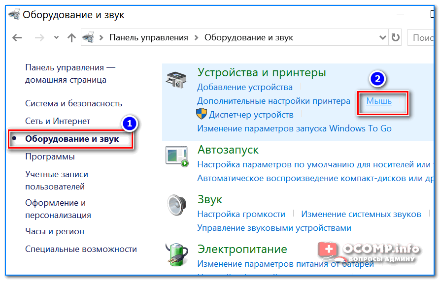 - Откройте панель управления и перейдите в раздел «Оборудование и звук». Зайдите в подраздел «Мышь».