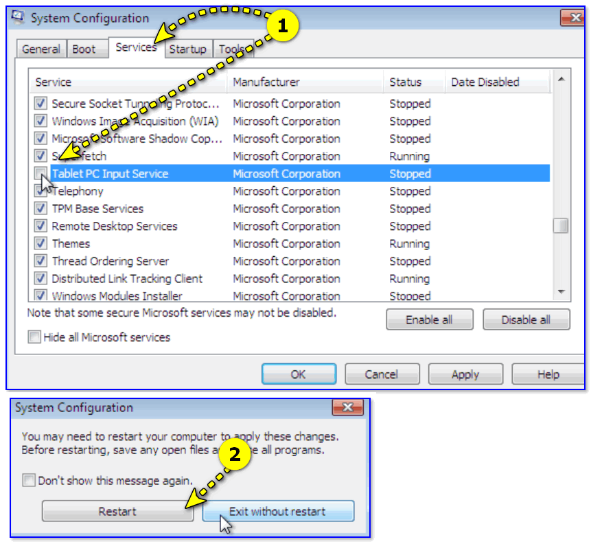 Далее перейти во вкладку «Services/Службы» , найти «Tablet PC Input Service» , снять с нее галочку и нажать OK. Разумеется, согласиться на перезагрузку ноутбука.