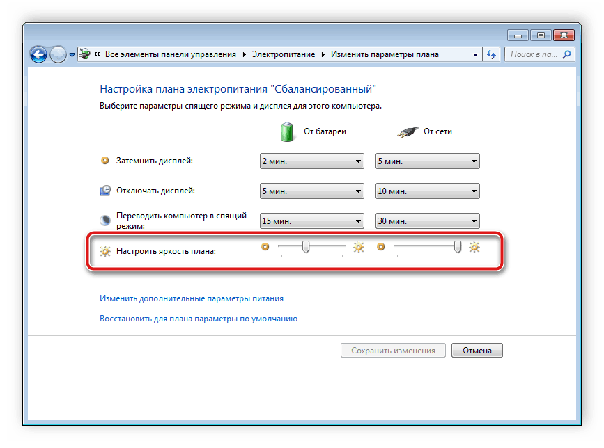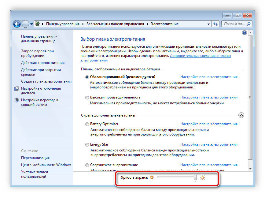 В Виндовс имеется встроенная функция, позволяющая настраивать план электропитания. Среди всех параметров там находится и конфигурация яркости. Изменяется она следующим образом: