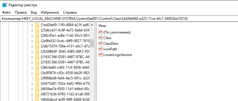 - маршрут перехода: HKEY_LOCAL_MACHINESYSTEMCurrent Control SetControlClass{4d36e968-e325-11ce-bfc1-08002be10318}�001;