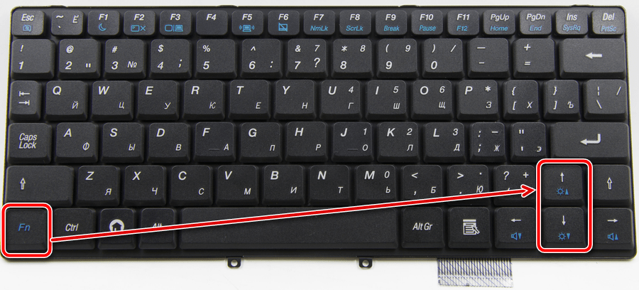 На клавиатуре большинства современных устройств имеются функциональные кнопки, активация которых происходит путем зажатия Fn + F1—F12 либо любой другой отмеченной клавиши. Часто яркость меняется комбинацией со стрелочками, однако все зависит от производителя оборудования. Внимательно изучите клавиатуру, чтобы на ней необходимую функциональную клавишу.