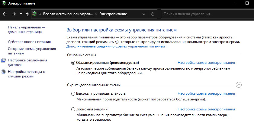 Нужно обратить внимание на ту схему, которая сейчас активна (слева от нее будет стоять черная точка). Возле нее имеется «Настройка схемы электропитания», на которую нужно кликнуть левой кнопкой мыши.