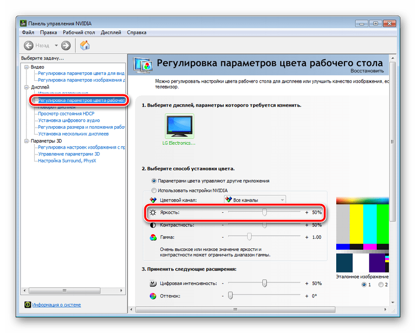 Откройте раздел «Дисплей», в нем найдите «Регулировка параметров цвета рабочего стола» и передвиньте ползунок яркости на необходимое значение.