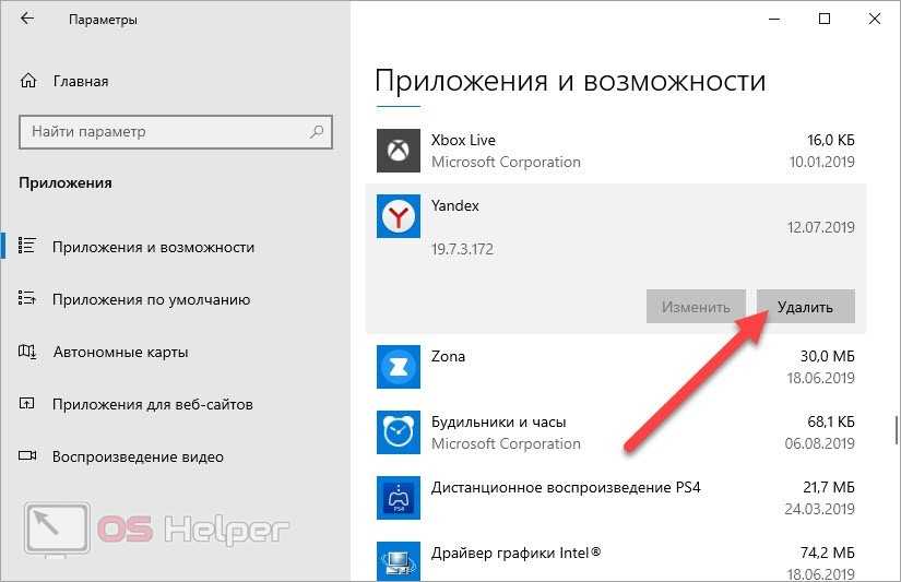 Сначала следует полностью избавиться от текущей версии программы. Для этого откройте раздел «Приложения» через параметры и найдите программу Яндекс. Кликните по кнопке «Удалить» и подождите завершения процедуры.