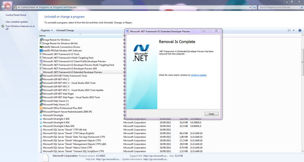 Чтобы установить NET.Framework на Windows 7, первоначально следует удалить предыдущие следы установки всех версий. Неопытным пользователям достаточно сложно проделать такие манипуляции , поскольку компания Microsoft достаточно плотно «переплела» системные папки с папками платформы. По этой причине предыдущая версия может очень сложно удаляться, или, вообще, нет возможности от неё «избавиться».