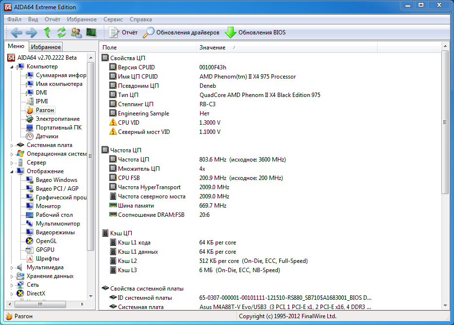 - Компьютер. В этом разделе можно получить суммарную информацию о самой машине, а также узнать о разгоне процессора, системе питания и проверить температурные датчики внутренних устройств.