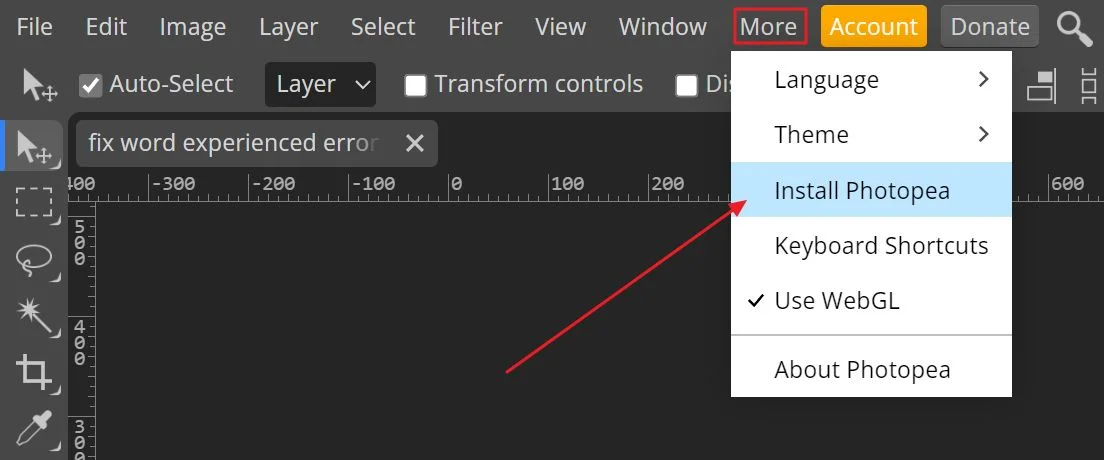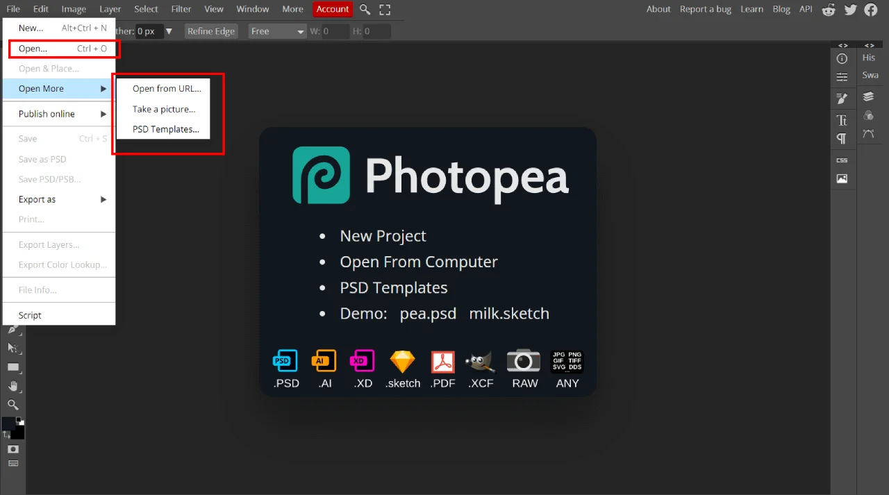 NOTE: Photopea also has the ability to open from a URL, taking a picture from your webcam, or PSD templates saved within its own system. This is located under, “Open More.”