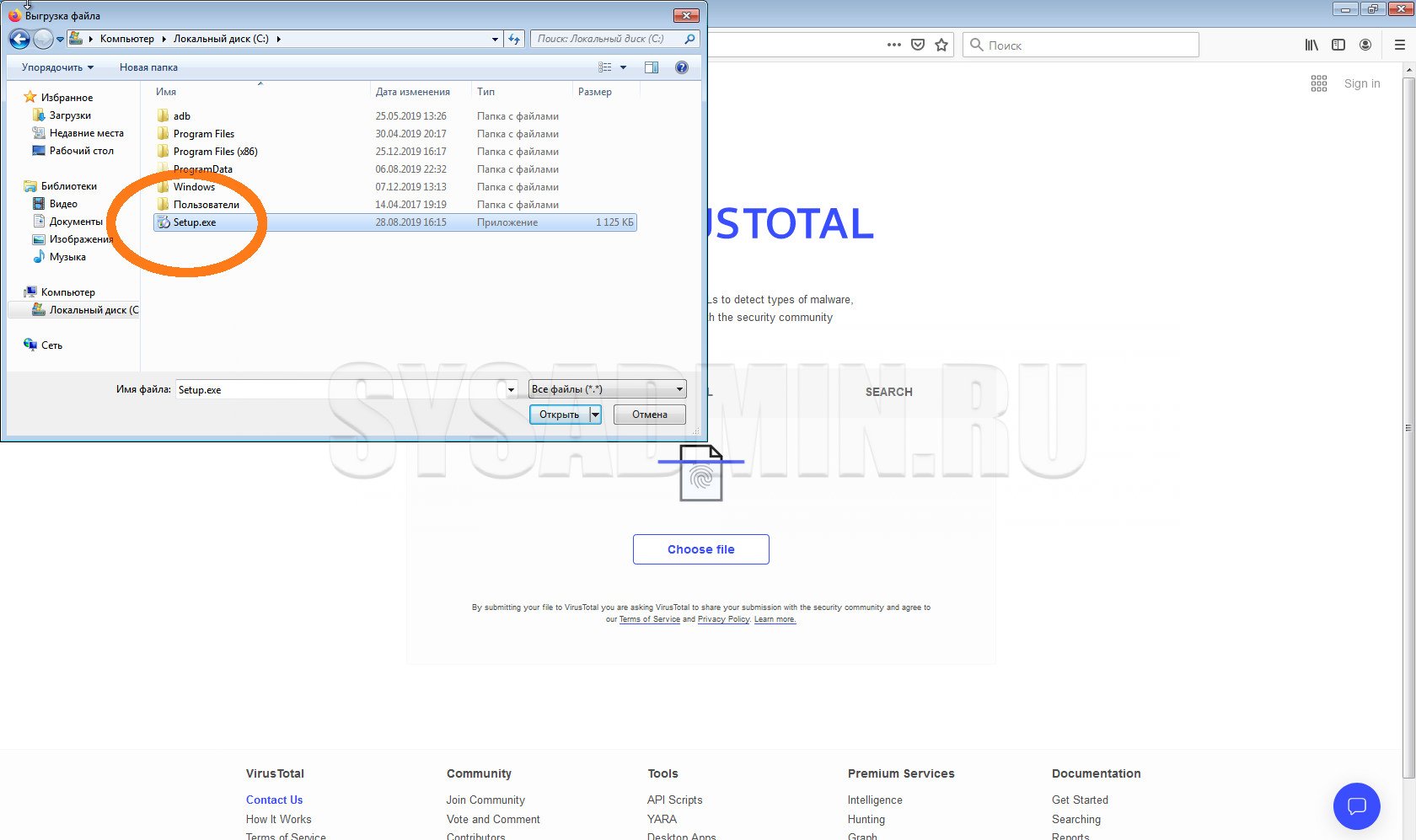 Далее, нажимаем на жирную кнопку «Choose file» и в открывшемся окошке выбираем наш файл, который мы хотим проверить. В данном примере файл setup.exe
