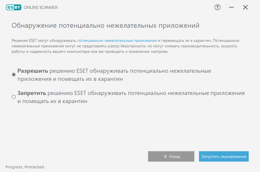 Теперь нужно выбрать: включать или нет обнаружение потенциально нежелательных программ. Для первого раза лучше включать обнаружение. Жмём желанную кнопку «Сканировать».