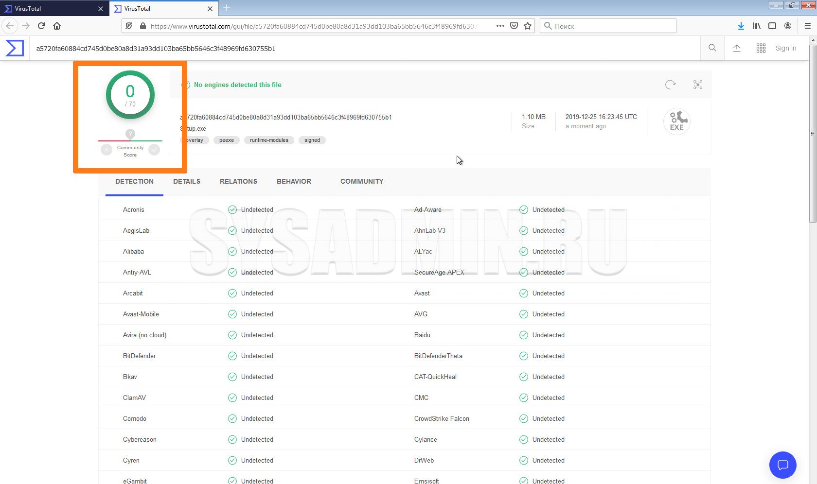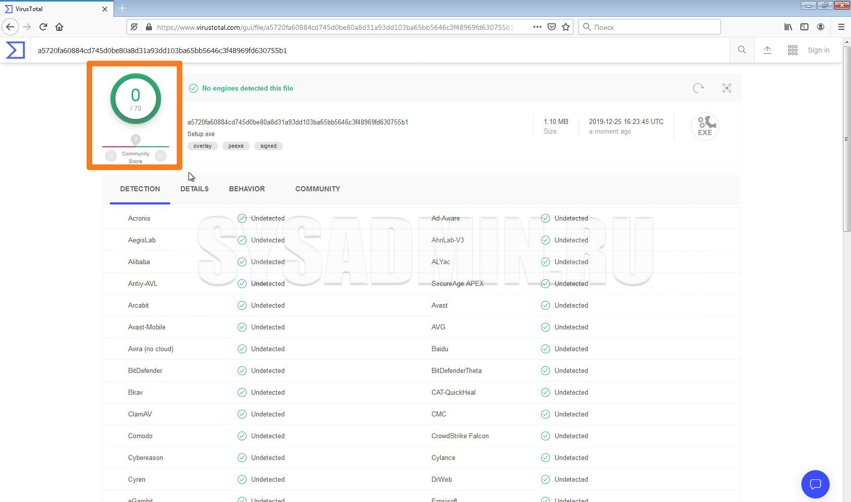 Как мы видим, файл был проверен 70 различными антивирусами и не один из них не обнаружил проблем с ним (надпись Undetected). В том случае, если какой-либо из антивирусов обнаружит проблемы с загруженным файлом, то вы увидите информацию об этом и цвет надписи изменится на красный.