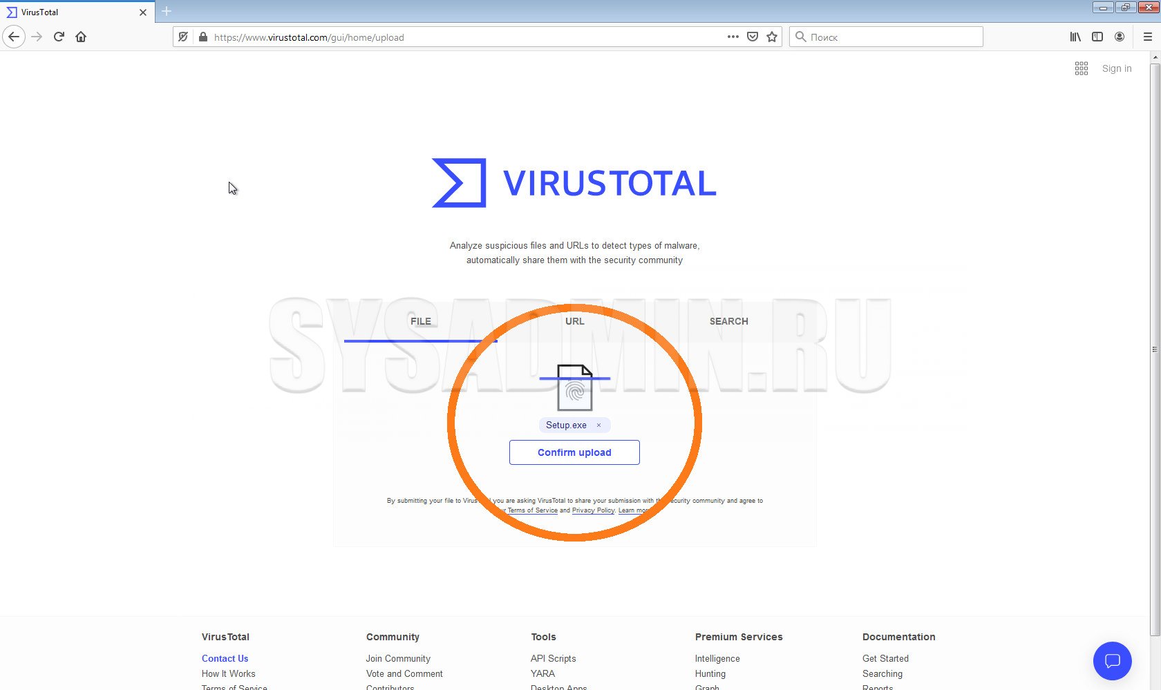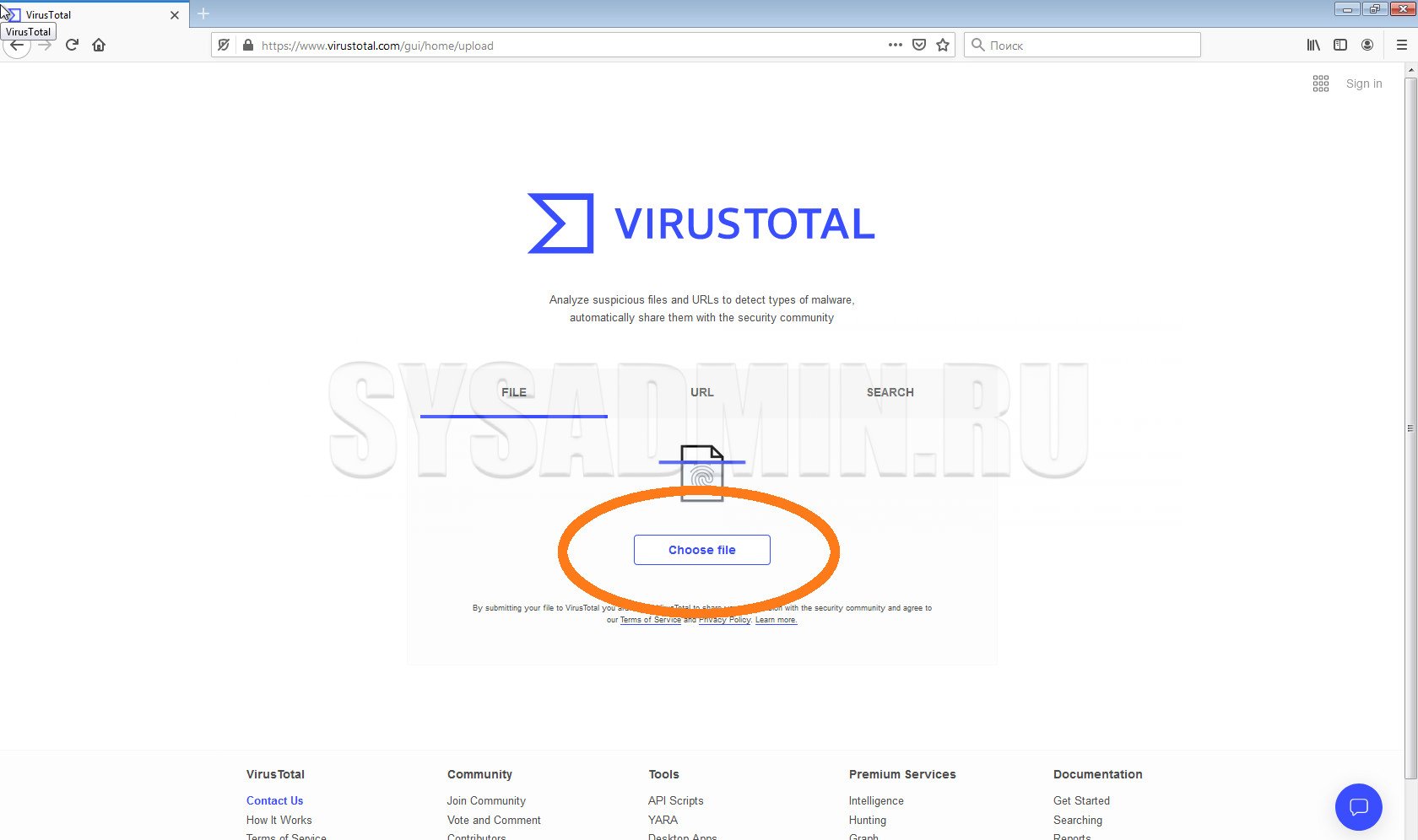 Первым делом переходим на сайт: https://www.virustotal.com/gui/home/upload