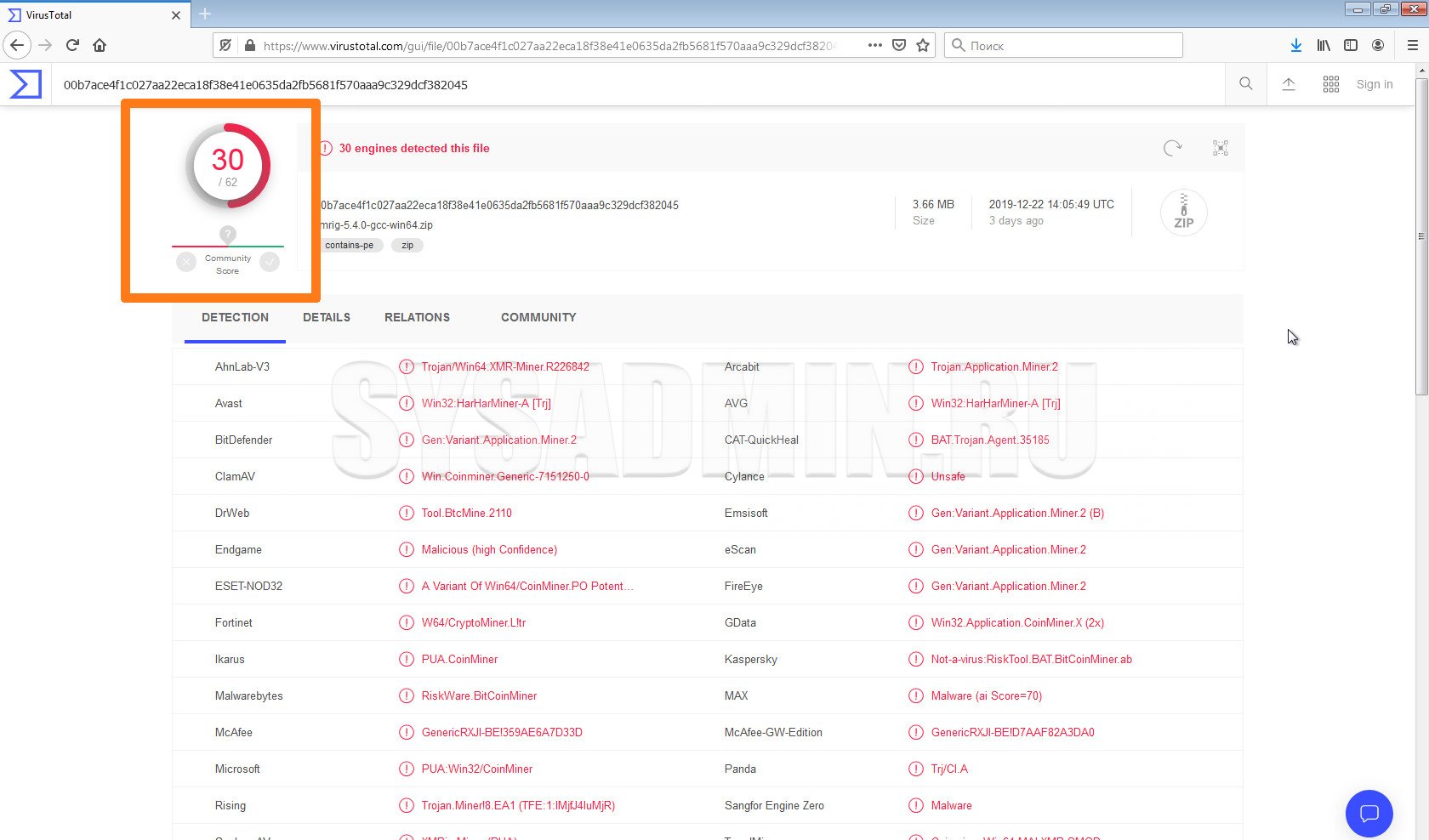 Вот пример, где в файле был обнаружена программа для майнинга криптовалют и большинство антивирусов об этом написало: