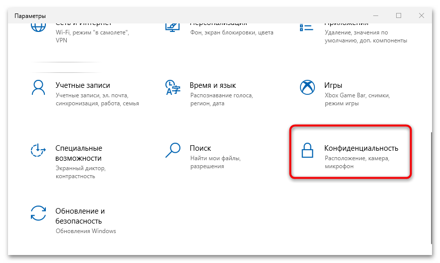 - В настройках перейдите в нижнюю часть экрана, где вы найдете режим конфиденциальности камеры. Выключите его и перезагрузите компьютер.